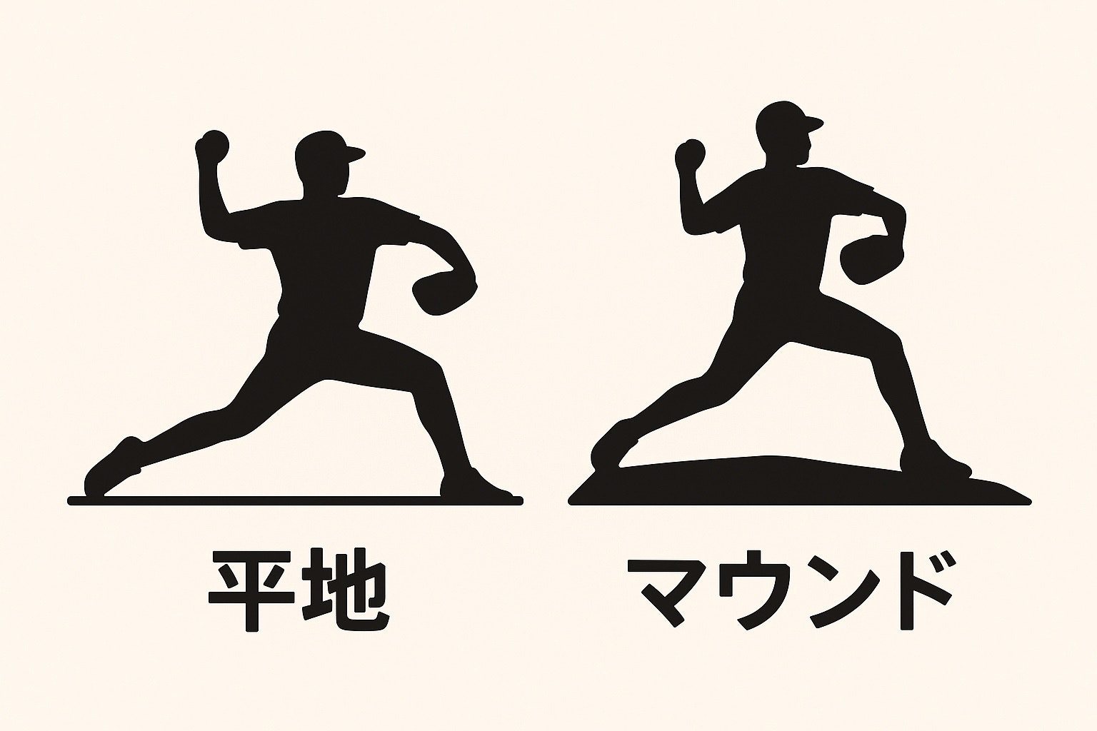 笑ってしまうぐらい当たり前の事だが、平地では、軸足と着地足が平面に対し、マウンドでは角度がついている。