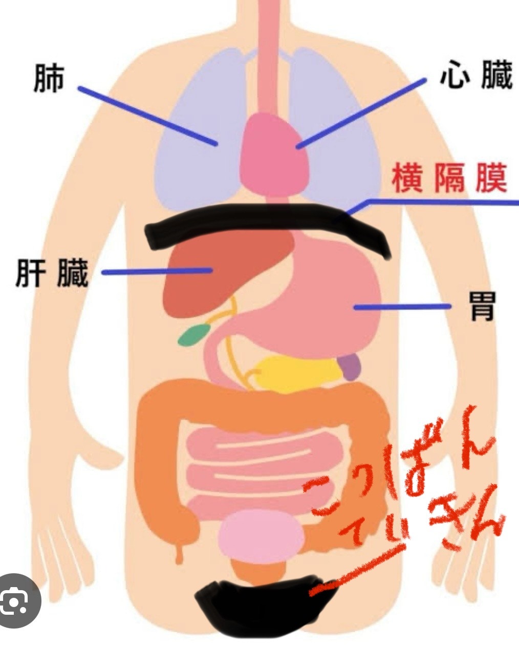 イラストのように、骨盤底筋群の上には種々の臓器が乗っかっている。そして、横隔膜の上には肺と心臓が乗っかっている。